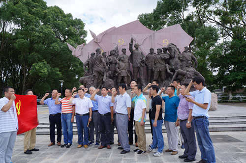 上海分公司黨總支組織開展“紅色之旅”教育 時間:2016-08-16 4061 8月12日,上海分公司黨總支組織部分黨員干部和入黨積極分子共18人,赴愛國主義教育基地福建古田開展“促兩學一做,走紅色之旅”教育活動,在“主席園”向毛主席像敬獻花籃,在“豐碑軍魂”雕像前面對黨旗重溫入黨誓詞,還仔細參觀古田會議地址和紀念館,回顧緬懷了老一輩無產階級革命家的不朽事跡。大家牢記“古田會議永放光芒”精神,紛紛表示:“不忘初心,繼續前行”。