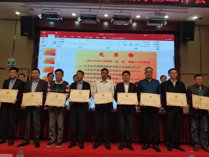 3月24日,2018年江蘇建筑業南方區工作會議在深圳召開,會議表彰了一批江蘇出省施工先進集體及先進個人?;葜莨颈唤K省住房和城鄉建設廳評為“2017年度江蘇出省施工先進集體”,總經理周群利、技術處主任陳申高被江蘇省住房和城鄉建設廳評為“2017年度江蘇出省施工先進個人”;史泰龍、孔祥明、王興東分別被江蘇省人民政府駐深圳(廣州)辦事處表彰為2017年度江蘇進粵、桂、閩、瓊施工質量安全、經營財務和新聞報道先進個人。