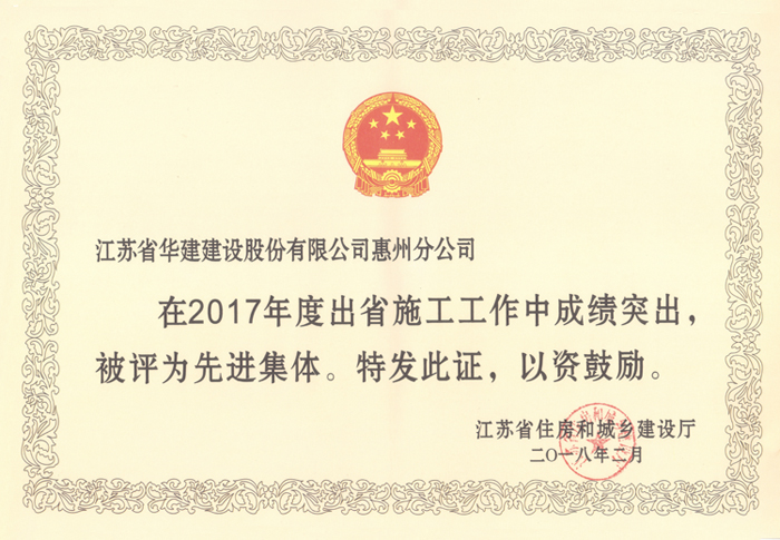 惠州公司獲評“2017年度江蘇出省施工先進集體”