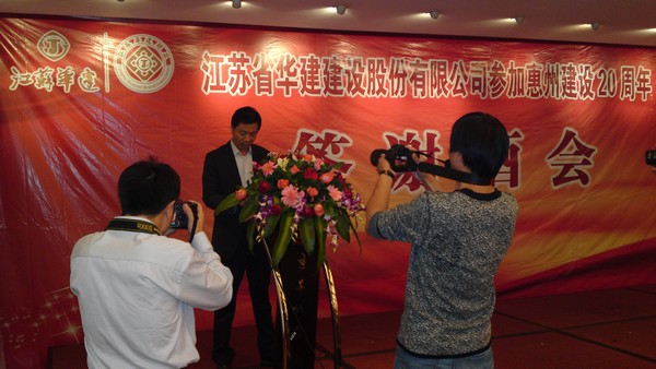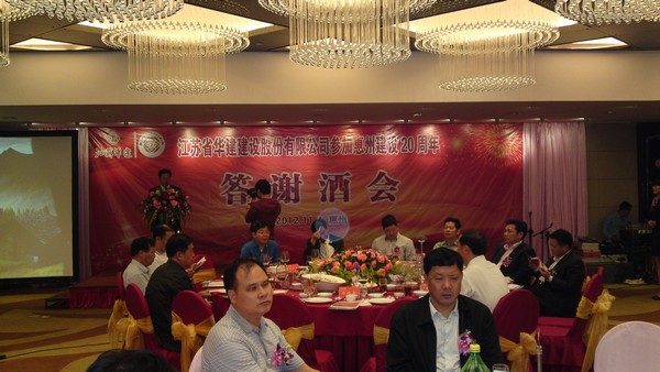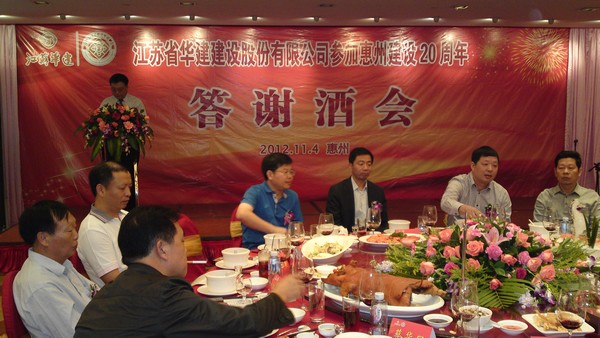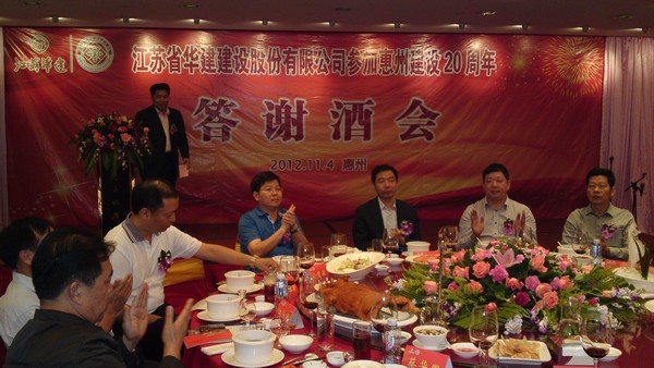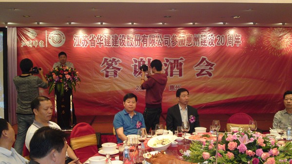 114,公司在惠州凱賓斯基酒店王子飯店隆重召開參加惠州建設20周年慶典暨答謝酒會,公司副董事長、總經理宗有農主持酒會并作開場致辭。惠州市有關政府部門、部分合作方企業的負責人,華建聯盟成員單位負責人,公司董事、監事和高管等130余人出席慶典。惠州公司總經理華恒榮介紹了公司參加惠州建設20年的有關情況。惠州市工商聯主席、公司戰略合作伙伴恒宇實業集團公司董事長楊滿芳代表合作方發言,惠州市住房和城鄉規劃建設局副局長陳訓政代表政府主管部門致辭,分別對江蘇華建進駐惠州施工、參加惠州建設20周年表示祝賀。公司董事長陸金龍代表公司總部對惠州市有關政府部門、相關合作方和社會各界人士給予公司的關心和支持表示誠摯的感謝,并表達了進一步加大支持力度、加強戰略合作、加快科學發展的意愿。