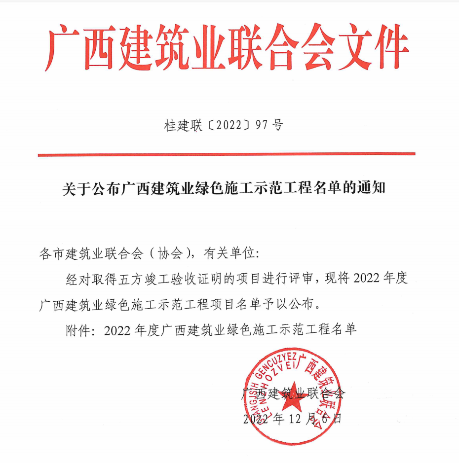 北京分公司兩項工程獲廣西建筑業綠色施工示范工程安全創優獎項 時間:2022-12-30 2003 近日,從廣西建筑業聯合會傳來喜訊,由北京公司總包承建的楊柳郡柳園1#、2#、3#、4#樓及地下室項目和楊柳郡柳園5#、6#、7#及地下室項目榮獲“2022年度廣西建筑業綠色施工示范工程”光榮稱號。