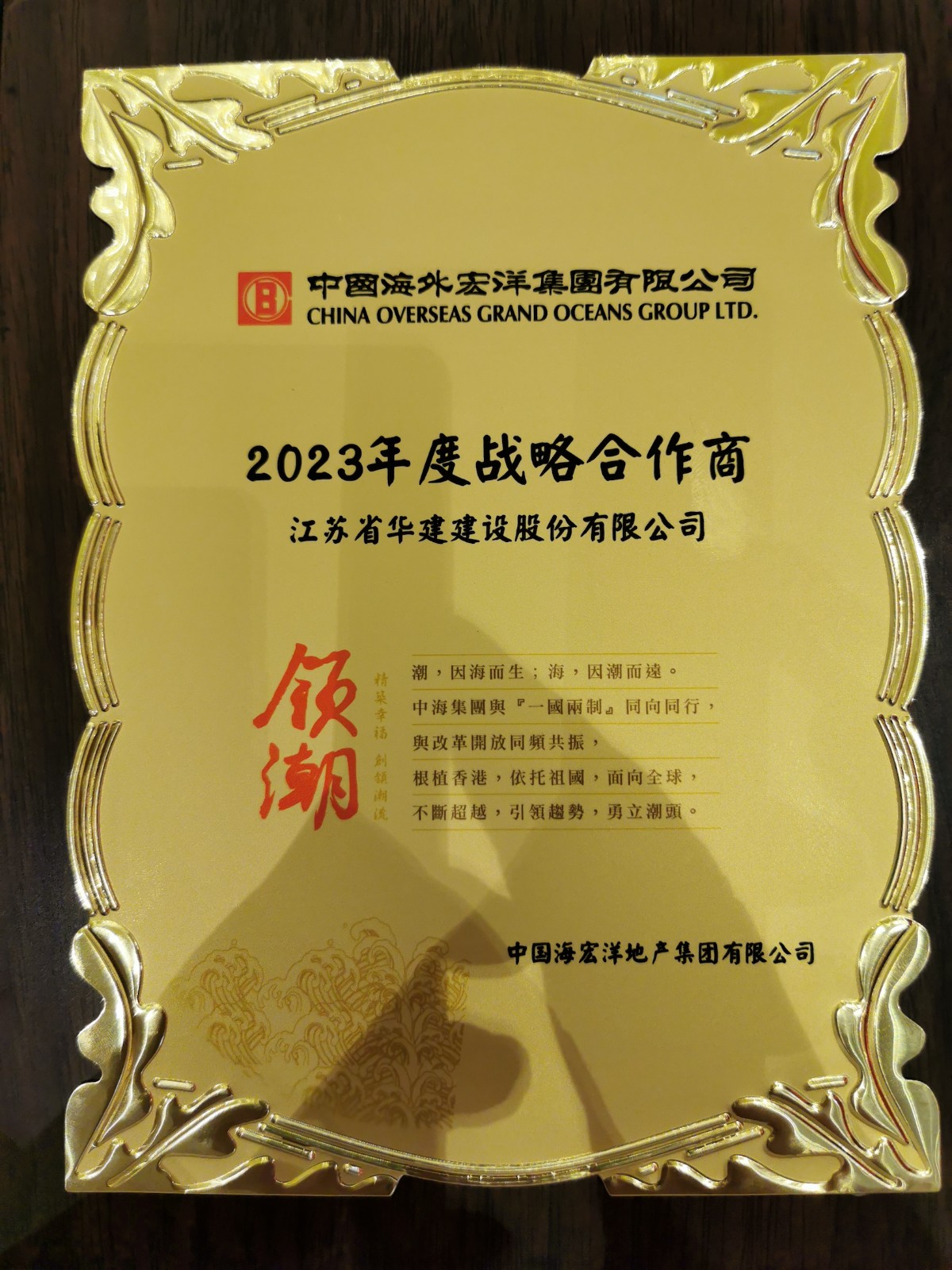 2023年5月12日,中海宏洋集團在深圳中信城市廣場舉行2023年度戰略單位簽約儀式,江蘇華建作為唯一新增總包單位入選戰略合作商名單。江蘇華建總經理吳碧橋、中海宏洋副總經理張海軍代表雙方簽約。