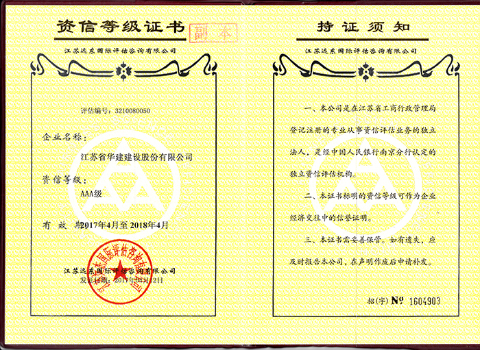 經江蘇遠東國際評估咨詢有限公司專家委員會審定,江蘇省華建建設股份有限公司資信等級為AAA級。