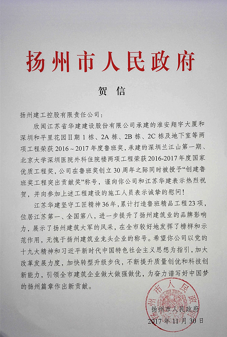 11月30日,揚州市人民政府專門發(fā)來賀信,對公司承建的淮安翔宇大廈、深圳和平里花園Ⅱ期1棟 、2A棟、2B棟、2C棟及地下室兩工程榮獲2016-2017年度魯班獎;深圳蘭江山第一期、北京大學(xué)深圳醫(yī)院外科住院樓兩工程榮獲2016-2017年度國家優(yōu)質(zhì)工程獎,以及在魯班獎創(chuàng)立30周年大會上被授予“創(chuàng)建魯班獎工程突出貢獻獎”稱號,表示熱烈祝賀,并向參加上述工程建設(shè)的施工人員表示誠摯的慰問。