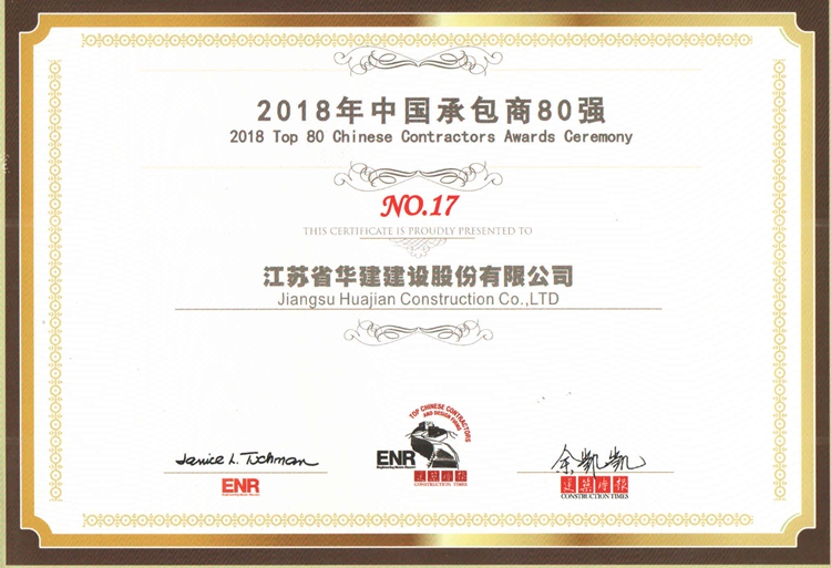 118日,由美國《工程新聞記錄》(簡稱ENR)和中國《建筑時報》主辦的2018中國承包商80強和工程設計企業(yè)60排名正式揭曉,江蘇華建再次入選中國承包商80強榜單,列第17位。