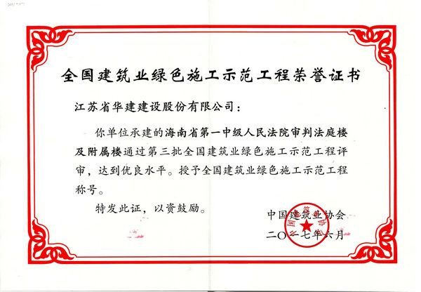 628-29日,中國建筑業協會綠色建造與施工分會在山東省濟南市舉辦全國建筑業綠色施工創新發展經驗交流會,對經竣工評審合格的工程頒發全國建筑業綠色施工示范工程證書。由海南公司承建的海南省第一中級人民法院審判法庭樓及附屬樓項目首次榮獲第三批全國建筑業綠色施工示范工程稱號。
