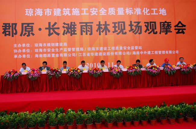 1130上午,郡原•長灘雨林項目現場彩旗招展,人頭攢動,一片熱鬧非凡的景象,由海南省瓊海市規劃建設局主辦,瓊海市安全生產監督局、建設工程質量安全監督站協辦,海南郡原置業有限公司、江蘇省華建建設股份有限公司和海南中外建工程管理有限公司承辦的建筑施工安全質量標準化工地現場觀摩會隆重舉行。省住房和城鄉建設廳副廳長劉聯偉、瓊海市安全生產監督管理局局長覃茂超、瓊海市規劃局副局長楊帆等相關領導出席并講話。