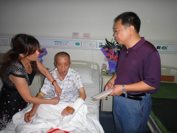 713上午,江蘇華建副總經(jīng)理、宜昌市揚州商會會長王宏、宜昌分公司總經(jīng)理呂進、第一工程處主任唐生健等一行,前往市二醫(yī)院看望香格里拉小區(qū)保安——英雄付永喜,并給他送去了慰問金。