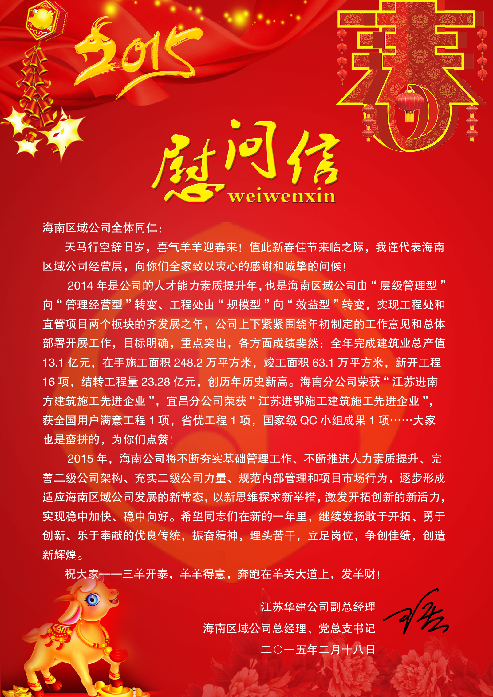 公司副總、海南區(qū)域公司總經(jīng)理王宏致全體員工新春慰問信