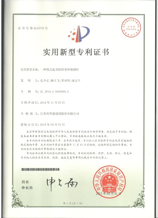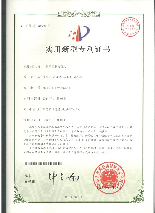 三項實用新型成果分別是:1、《一種預留洞用模具》(專利號:ZL201420647560.1,專利權人:孔令正、嚴正濤、楊玉飛、郭冬冬);2、《一種型鋼混凝土的模板支撐結構》(專利號:ZL201420647633.7,專利權人:孔令正、楊玉飛、曹亞明、郭冬冬);3、《一種塔式起重機附著伸縮撐桿》(專利號:ZL201420647600.2,專利權人:孔令正、楊玉飛、曹亞明、湯文平)。