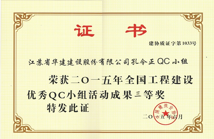62325日,由中國建筑業(yè)協(xié)會(huì)舉辦的“2015年全國工程建設(shè)優(yōu)秀QC小組活動(dòng)成果交流會(huì)”在云南昆明舉行。珠海區(qū)域公司“江蘇省華建建設(shè)股份有限公司孔令正QC小組” 經(jīng)江蘇省建筑行業(yè)協(xié)會(huì)推薦參加交流會(huì),其成果《剝蝕丘陵地貌多形截面鋼筋混凝土灌注樁施工新方法》榮獲中建協(xié)QC成果三等獎(jiǎng)。中國建筑業(yè)協(xié)會(huì)QC成果獎(jiǎng)是建筑領(lǐng)域QC成果最高獎(jiǎng)項(xiàng),該獎(jiǎng)項(xiàng)的獲得是對公司在技術(shù)質(zhì)量管理工作方面的充分肯定。此外根據(jù)該項(xiàng)成果編寫的工法還獲得2014年度江蘇省省級工法。