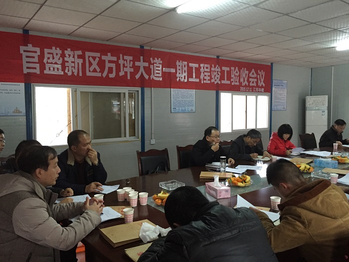 官盛新區管委會規建處主任柏魯代表驗收小組發言,宣讀了驗收小組驗收結論,原則同意驗收意見。他總結指出,方坪大道一期竣工驗收代表了官盛新區建設取得了又一項重要成果,希望各參建單位再接再厲、再創佳績。李榮盛常委作總結發言,他表示方坪大道一期的竣工驗收實屬不易,對該工程竣工驗收表示熱烈祝賀,同時充分肯定了江蘇華建前階段工作,對現場工程質量、安全生產、文明施工、工程進度給予了高度評價。