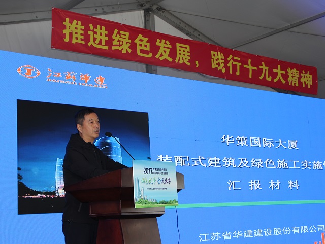 公司總工周學(xué)軍在現(xiàn)場(chǎng)會(huì)上對(duì)華策國(guó)際大廈工程綠色施工和裝配式技術(shù)應(yīng)用情況進(jìn)行了介紹