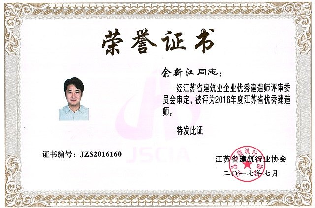 公司1位同志被授予“江蘇省優秀建造師”榮譽稱號 時間:2017-12-12 3898 日前,江蘇省建筑行業協會下發了《關于2016年度江蘇省建筑業優秀建造師的決定》,公司余新江同志位列榜單,榮獲表彰,被授予“江蘇省優秀建造師”榮譽稱號。