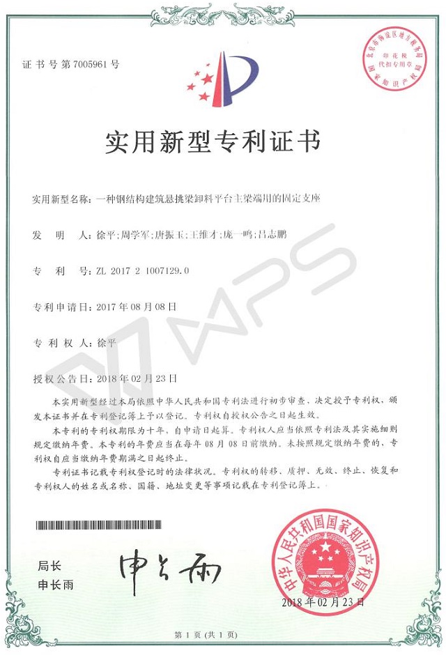 近日,從國家知識(shí)產(chǎn)權(quán)局傳來喜訊,公司申請(qǐng)的《一種鋼結(jié)構(gòu)建筑懸挑梁卸料平臺(tái)主梁端用的固定支座》獲得實(shí)用新新型專利授權(quán)。