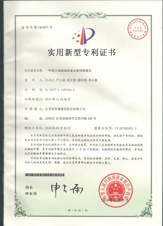近日,從國家知識產權局傳來喜訊,公司申請的《一種剪力墻嵌墻設備安裝預留模具》獲得實用新型專利授權。