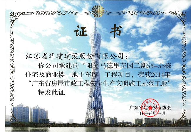 陽光馬德里二期工程榮獲2014年廣東省房屋市政工程安全生產文明施工示范工地