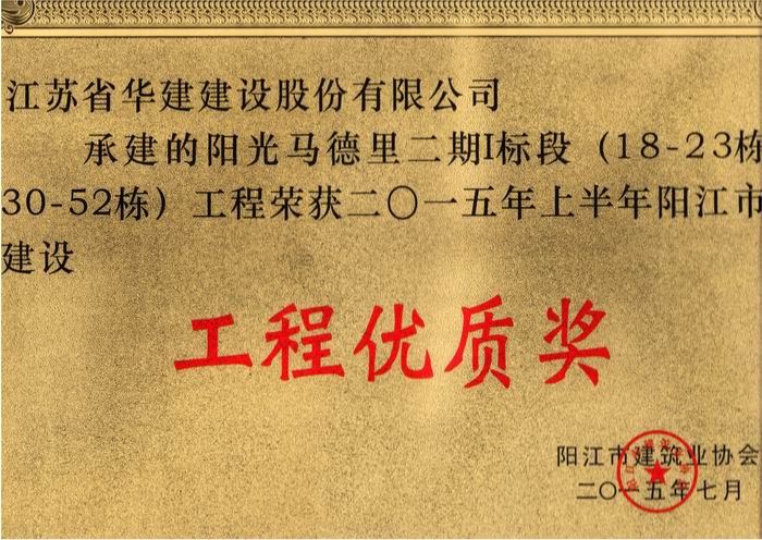 陽(yáng)光馬德里二期I標(biāo)段(18-23棟、30-52棟)工程獲 2015年上半年陽(yáng)江市建設(shè)工程優(yōu)質(zhì)獎(jiǎng)