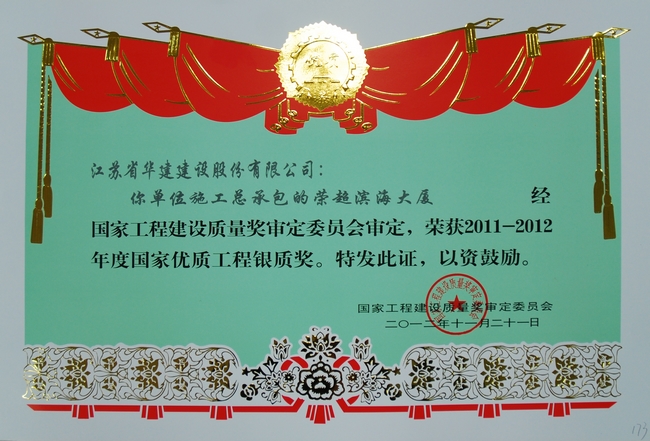 該工程先后榮獲2007年度深圳市優質結構工程獎、2010年度深圳市優質工程“金牛獎”、江蘇省“揚子杯”優質工程獎,2012年項目QC管理小組榮獲“全國工程建設優秀質量管理小組”稱號,11月被評為2011-2012年度國家優質工程銀質獎。